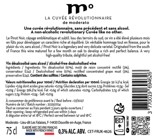 Moderato haalt inspiratie uit unieke knowhow om een ​​nieuwe stijl van alcoholvrije kwaliteitswijn te creëren. Ons doel is om het genot te behouden en tegelijkertijd de consumptie zo goed mogelijk te beheersen en de smaak en beleving van wijn centraal te stellen. We selecteren de beste druivensoorten om kwaliteitswijnen te verkrijgen die we subtiel in alcohol reduceren en vervolgens assembleren met behulp van onze knowhow en de expertise van onze oenoloog. Het resultaat: behouden aroma’s en een nieuw evenwicht, voor een unieke stijl vol smaak! Het is onze inzet om onze producten op verantwoorde wijze te ontwikkelen door de impact van de wijnbouw op de planeet te verminderen en door de grondstoffen die voor onze flessen worden gebruikt te optimaliseren. 0,0% alcohol, 0 pesticiden.