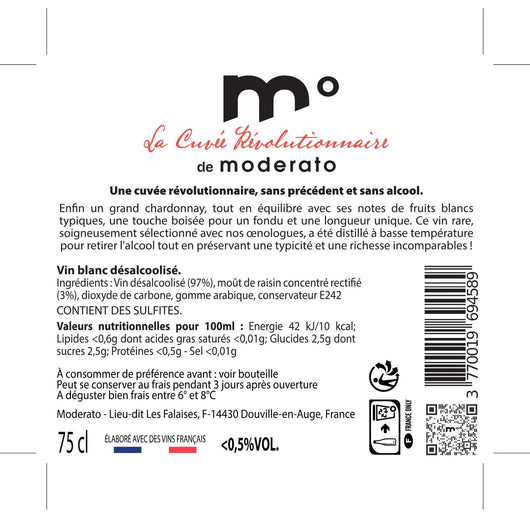 De Witte wijn zonder alcohol Chardonnay - Cuvée Révolutionnaire Limited Edition 0,5% is een zeldzame alcoholvrije wijn, geselecteerd door Moderato-oenologen, voor onvergelijkbare typiciteit en rijkdom (<0,5% alcohol)