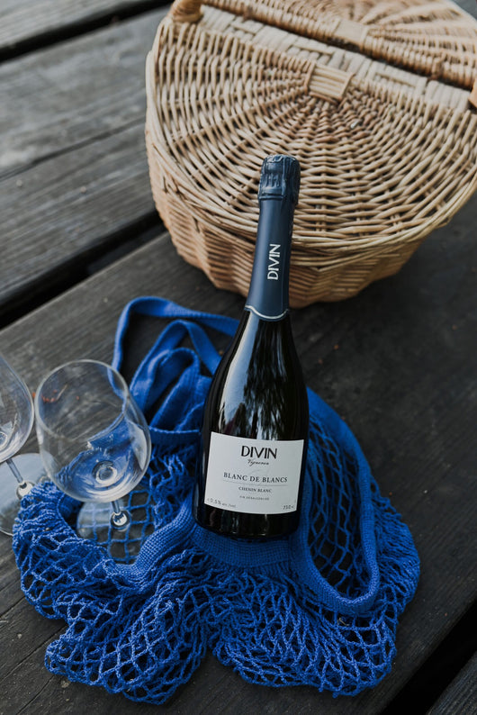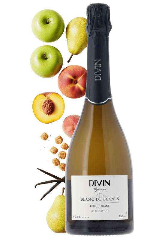 Wij presenteren u de mousserende wijn Chenin blanc Divin Vigneron Blanc de Blancs zonder alcohol 0,5%.