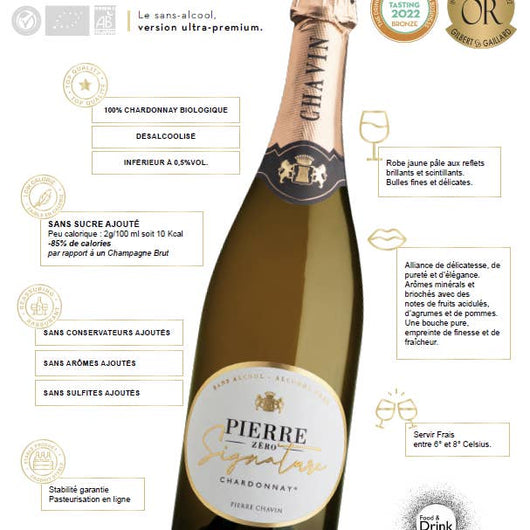 Een alliantie van delicatesse, zuiverheid en elegantie, Pierre Zéro Signature Blanc is zonder toegevoegde suikers, bewaarmiddelen, smaakstoffen en sulfieten.