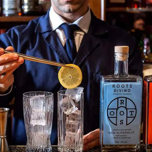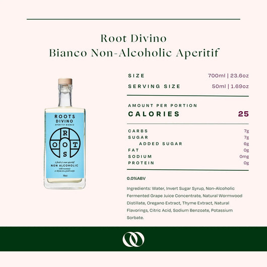 ROOTS DIVINO is een alcoholvrije vermouth. Een 0% ambachtelijk aperitief gemaakt van wijn (di vino), vervolgens doordrenkt en gemacereerd met absint, rozemarijn, gentiaan en andere mediterrane planten.